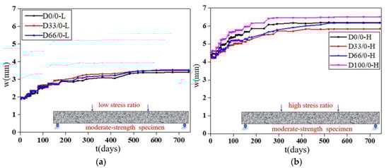 Deflection-load holding time curves of the moderate strength specimens. (a) Specimens under a low stress ratio; (b) specimens under a high stress ratio.