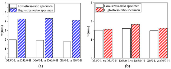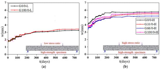 Figure 13 shows the effect of the stress ratio on the deflection of the specimens. Compared with the low stress ratio, the initial deflection of the specimens increases greatly at a high stress ratio, and the deflection increases slightly with time. This occurs because the specimen will produce a larger instantaneous deflection under a large loading force. At the high stress ratio in this study, the nonlinear deformation of the specimen just begins, so the deflection will increase slightly with time compared to that at a low stress ratio.