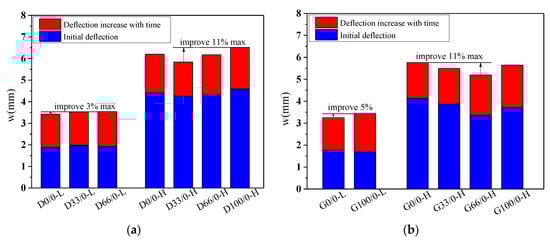 Effect of the stress ratio on the deflection of the specimens. (a) Initial deflection of the specimens; (b) deflection increases of the specimens with time.