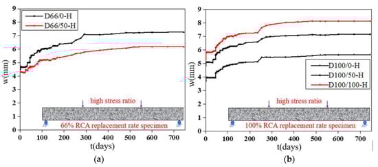 Deflection-load holding time curves of the specimens with different RFA replacement ratios. (a) Specimens with a 66% RCA replacement rate; (b) specimens with a 100% RCA replacement rate.