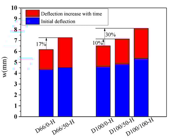 The midspan deflection time history of each specimen was very similar. Taking D100/0-H as an example, its deflection-load holding time curve is shown in Figure 7.