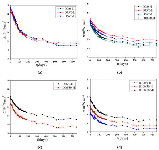 Under the long-term loading, the deflection values of the specimens increase with time, and the stiffness decreases. The midspan stiffness “B” can be calculated by Equation (1) from the deflection “w”.