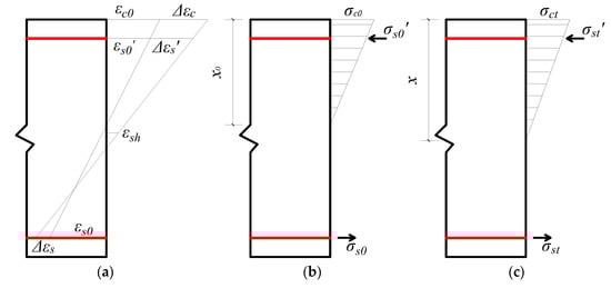 Under the effect of long-term loading, the stress–strain distribution of the concrete beam section is shown in Figure 15.