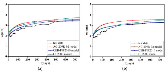 In the formula, and are generally calculated by the shrinkage and creep prediction model of concrete. The common concrete prediction models of shrinkage and creep are the CEB-FIP2010 model [57] proposed by the European Concrete Association, the GL2000 model [58], and the ACI209R-92 model [59] proposed and recommended by the American Concrete Association. However, by analyzing the above models, the following observations can be made: