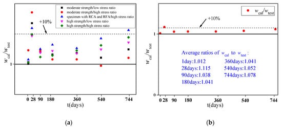 It can be seen that, at a low stress ratio, the initial deflections of the specimens with different RCA replacement ratios are almost the same, the increases over time of the deflection of the specimens with RCAs are larger than those of the NAC beams, and the maximum deflection of the beams with RCAs is 8% larger than that of the NAC beams after 744 days of load holding. This shows that the RCAs had a substantial effect on the deflection of the specimens with a low stress ratio. Because a certain amount of old cement mortar was attached to the surface of the recycled aggregates, the total amount of mortar was higher than that of the NAC; at the same time, the interface transition area of the RAC was more complex, and weak links easily formed in the interface. When RCAs are crushed, more initial microcracks are produced in the interior, which leads to large creep and shrinkage values for the RAC. However, at a high stress ratio, the conclusion is different from that of the low stress ratio study, and there is no evident effect of the RCAs on the time-dependent behavior of the specimen. When concrete is continuously loaded, it is generally considered that the strain will enter into the nonlinear stage when it exceeds 40% of the critical force, that is, the strain and the force are nonlinear, leading to a substantial increase in the deflection until damage occurs. The nonlinear deformation phenomenon is mainly caused by the microcracks on the interface between the aggregates and the cement slurry. Therefore, under a high stress ratio, the deflection of the specimen is affected by both the stress ratio and the recycled aggregates. However, due to the limited experimental data, the contribution of the two factors to the time-dependent behavior could not be determined in this study. Scholars have found that the deflection of RAC beams and the increase in RCAs have no clear trends, which also confirms the conclusions. The research performed by Adam M. Knaack [52] and Won-Chang Choi [53] shows that the deflection under long-term loading of several groups of beams with different replacement rates of recycled aggregates exhibits only slight differences for a certain load holding time.