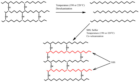 It is possible to replace part of the SBS with a waste product such as recycled rubber during the production of polymer modified bitumen. To achieve this, the rubber must be converted from a cross-linked polymer into a thermoplastic polymer in the process of de-vulcanization. The de-vulcanized rubber was next used to create the joint net with SBS while cross-linking. The de-vulcanization and cross-linking were carried out at different times at temperatures of 190 °C and 220 °C. The co-vulcanization process carried out at 220 °C with the 10% rubber content was very fast, whereas modification at 190 °C required a longer time. As a result, products that meet the standards (PMB 45/80-55 PG 70-22) according to AASHTO-MP1, were obtained. Almost all functional properties of bitumens modified in this way reached the values for PMB. Particularly noteworthy were their high elasticity, high softening point, and favorable low-temperature properties. This means that for road building purposes, the waste product of recycled rubber can partially replace much more expensive SBS.