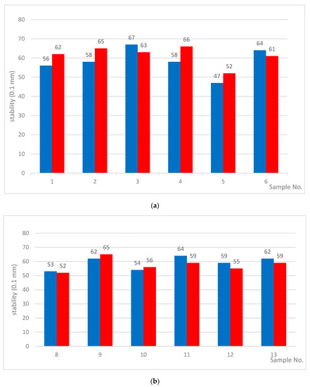 The values of penetration at 25 °C, softening point (R&B), penetration index (IP) according to EN 12591/Ann.A., elastic recovery, softening point after RTFOT, mass change after RTFOT, and stabilities are the mean of three determinations. The values such as penetration index, delta R&B, and increasing of softening point after RTFOT were calculated based on these mean values. The values of the Fraass breaking point refer to one measurement.