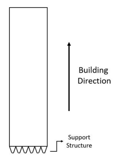 The workpieces investigated in this work were produced on a DMP Flex 350 machine (3D Systems, Leuven, Belgium) using LaserForm Ti Gr23 (A). Rectangular blocks with 55 × 15 × 4 mm3 dimensions were manufactured in the upright position (Figure 1). The process chamber was filled with argon to provide an inert atmosphere. The manufacturer provided the processing parameters and build settings, such as the laser power, scanning speeds, and strategies. The resulting vertical surfaces, which exhibited a high degree of roughness due to powder attachment and the layer-by-layer building process, were selected for the laser post-processing investigation.