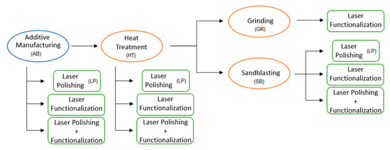 In this research, the topography, wettability, surface chemical composition, and cell growth viability were assessed for LPBF parts at different stages of the process chain (Figure 2). After-treatment methods commonly adopted following LPBF included heat treatment for stress relief, grinding, and sandblasting for powder particle removal. At first, samples without any previous laser treatment were submitted to such post-processes. Their starting topographies regarding the powder attachment condition were as follows: Without removal directly after additive manufacturing (AB) and heat treatment (HT); partially detached following sandblasting (SB); and completely eliminated with grinding (GR). The surfaces resulting from the LPBF and from each mentioned post-process were considered the initial conditions of the respective steps.