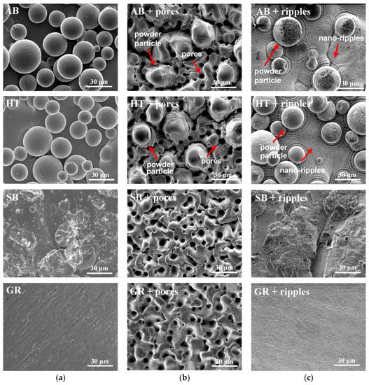 The ultrashort laser alone was not capable of removing the irregularities on the samples. Instead, when powder remained sintered, i.e., AB and HT starting conditions, the nano-ripples were formed both in the part’s and particle’s surfaces (Figure 3c, AB + ripples and HT + ripples), while residues of such adjunct were still detected among the porous structure formation (Figure 3b, AB + pores and HT + pores). The generation of structures that are more homogeneous is possible when the presence of sintered particles on the surface is partially or completely eliminated in advance (Figure 3c, SB + ripples and GR + ripples). The pores formed are very similar in size and distribution when sandblasting and grinding are the preceding procedures (Figure 3b, SB + pores and GR + pores), while for the nano-ripple formation, the fact that the initial topography could not be completely flattened through sandblasting is still evident (Figure 3c, SB + ripples).