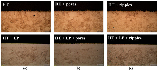 Cross-section images of the heat-treated samples: (a) Before and after laser polishing; (b) with ultrafast laser treatment for pore formation; and (c) with ultrafast laser treatment for nano-ripple formation.