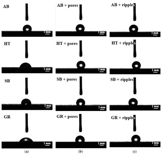 In terms of specific applications, the impact of the manufacturing, or post-processes, on the functionality of the parts is a major concern. For this reason, the investigated samples were assessed for their wettability characteristics, subsequent to all of the stages described in the previous section. In this case, the different topographies obtained with and without any laser post-treatment resulted in different wetting behaviors (Figure 6 and Figure 7).