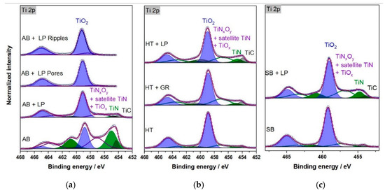Amongst the conditions prior to any laser treatment and after laser polishing, further doublets were detected, with Ti 2p3/2 at 454.2, 455.0, and 457.0 eV corresponding to TiC, TiN with its satellite [34], and TiNxOy, respectively. The matching C 1s peak of TiC could be found at 282.3 eV, whereas N 1s of TiN appeared at 396.4 eV (not shown here). The highest amount of TiN and TiC detected occurred after additive manufacturing, which took place under an inert atmosphere provided by an argon filled chamber. This was unlikely to have been caused during the LPBF process, and the discrepant nitrogen content on the AB parts could be the result of an external interaction with titanium after the process. Subsequent procedures, such as heat treatment and sandblasting, led to less noticeable peaks of TiN and TiC. The same is true for the ground samples, although in this case, the TiN and TiC peaks were more pronounced when compared to the heat-treated and sandblasted samples. All three steps were performed without inert atmospheres.