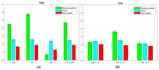 When submitted to laser polishing, the AB, HT, and SB workpieces exhibited a Ti:Al proportion of 2.3, 3.6, and 2.1, respectively (Figure 10b). The most relevant change occurred on the SB parts, in which a substantial growth of titanium, alongside a reduction of aluminum, led to a significantly higher quotient. In contrast, a notable increase of aluminum contributed to lower ratios on AB and HT samples. A similar behavior was observed for the surfaces with pore and nano-ripple formation for all cases, resulting in a Ti:Al proportion of around 2.2 ± 0.2 (Figure 10a,b). In the same way, the ratio Ti:V can be assessed. While in the first processing steps, no vanadium oxide could be detected in most cases (Table 3), all pore and nano-ripple functionalized workpieces showed a similar Ti:V ratio of 20 ± 2, which is comparable to the theoretical value of 24 calculated from the expected stoichiometry. Therefore, the final outcomes, namely Ti:Al:V proportions, were comparable in every condition, regardless of the type of laser process to which they were subjected.