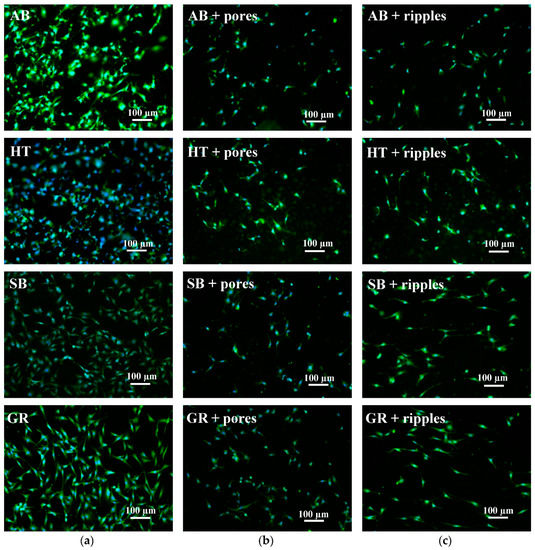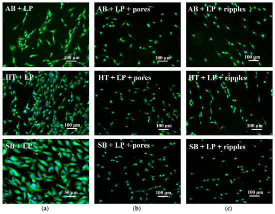 Fluorescence images of MC3T3-E1 cells growing on the surfaces of parts: (a) Without laser treatment; (b) with ultrafast laser treatment for pore formation; and (c) with ultrafast laser treatment for nano-ripple formation.