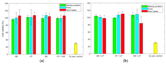 Cell viability (in percentage) of MC3T3-E1 cells cultivated with the extracts from ultrafast laser treated AM Ti Gr 23 samples compared with the negative control (100% viability) and their initial conditions: (a) Individually; and (b) combined with laser polishing.