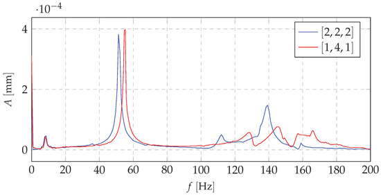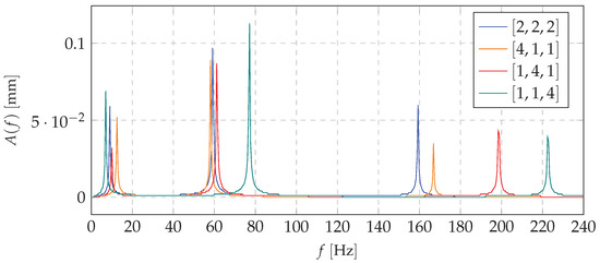 Analyzing the data presented in Figure 11, Figure 12 and Figure 13, it can be concluded that the proposed shaping method of the frequency structure causes the observable change in a dynamic behavior of the whole system. It can be stated that, for the each mass distribution case, there is a corresponding eigenfrequency which will change during the redistribution process. Increasing the mass density at a selected node allows one to change the natural vibration frequency up to 25% in comparison to the remaining configurations (distributions of the mass). Such changes in a frequency structure cause various frequency responses under the harmonic excitation. It means that, even if the system reaches its natural frequency, it is possible, thanks to the SPS, to change the mass distribution and, in consequence, limit the value of vibration amplitude. Moreover, theoretical and experimental analyses indicate that particular changes affect only selected eigenfrequencies. It is very important from the practical point of view because it allows us to control only a narrow band of the FRF. The remaining part of the spectrum will not be changed. It provides predictable dynamics of the system and makes the control process easier.