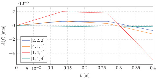 Obtained results confirmed the fact that the change in mass distribution will shift the resonant range. In the simulations, the harmonic force was introduced into the system. The investigated cantilever beam was subjected to various resonance loading frequencies. This allows us to observe the form of vibrations and to present a way for the mass distribution to influence the dynamics of the structure during operation. In Figure 3a, Frequency Response Functions (FRFs) for all cases under consideration are presented.