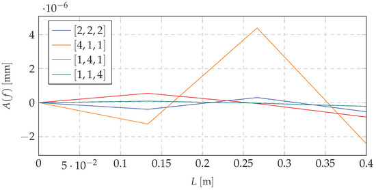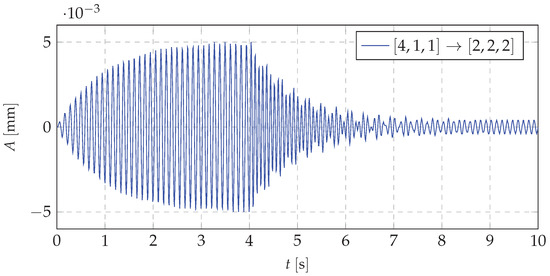 Based on the mathematical model, and taking into account the excitation with the first natural frequency, the first forms of vibration were obtained. Shifting the mass to the proper node (choice of the node depending on the system dynamics and its initial mass distribution) decreases the amplitude of the dynamic response. It is possible to use that concept to switch the system states depending on the loading force pulsation. This approach ensures that the excitation forces will not cause a resonance or that it would appear in the short period of time. Figure 4 and Figure 5 present simulations for beam vibrations for all four redistribution cases, based on the resonance frequency of the case of the first and second eigenvalue ( and ). Several integration procedures were applied, in order to carry out numerical simulations. The best results were obtained with Runge–Kutta fourth order algorithm.