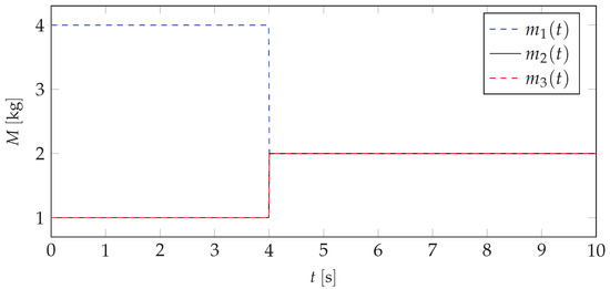 Analyzing the data depicted in Figure 4, Figure 5 and Figure 6, it can be stated that there is a possibility to avoid the resonant range by shifting the mass. It means that the mass redistribution process can be the basis for the efficient method of controlling the dynamics of the vibrating system. In the proposed method the mass transfer is carried out in a static way. Furthermore, simulations are based on the beam vibration analysis during the mass redistribution process. It means that the moving of the mass took a certain time. This causes the need for the investigation of the system behavior, depending on how the process of mass redistribution is carried out. Figure 7 presents time plot of masses changes at nodes during the system operation.