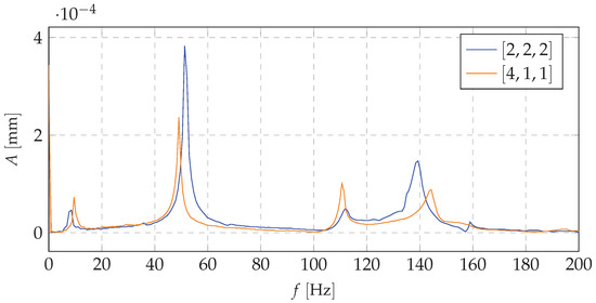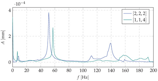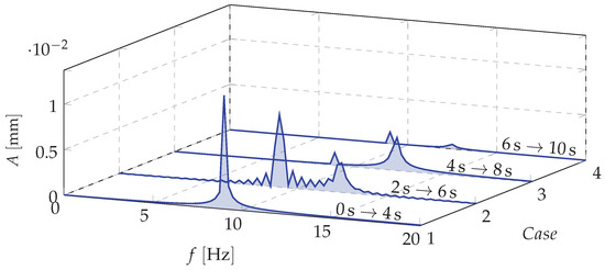 The spectral analysis of vibrations displacements of the investigated cantilever beam during the dynamic mass redistribution process is depicted in Figure 9. Three types of vibrations can be distinguished: 1—vibrations of the beam with the mass being shifted to a specific point (node 1) (from 0 to 4 of simulation); 2—Beam vibrations during mass transfer (from 4 to 8 of simulation); 3—Beam vibrations with a homogeneous mass distribution (from 8 to 10 of simulation). Analyzing the data depicted in Figure 8a significant change in the displacements of the beam end can be observed. It could mean that the vibration frequencies during this process reach unexpected values. An amplitude spectrum of the beam vibrations (Figure 9) shows that the mass redistribution phenomenon causes ”blurring” of natural frequencies. It means that there is an intermediate process causing a smooth transition from the initial (in the resonance) to the final (beyond resonance) dynamic state. This is crucial because there is no risk of falling into other, unpredictable resonant ranges.