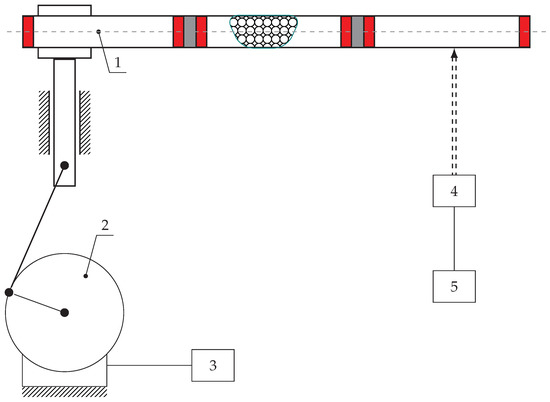 Scheme of the test stand (1—sponge particles beam; 2—motor; 3—inverter; 4—laser sensor; 5—data acquisition system).