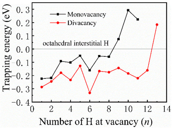 Most previous theoretical work focused on H-trap behavior at the monovacancy [13,31,32]. However, more complex defects may be formed during the irradiation process; therefore, H-trap behavior at monovacancies and divacancies were both studied in this study. Figure 2 shows the structure diagrams of different H-vacancy configurations. H atoms were put into the vacancies one by one, and the numbers in Figure 2 represent the sequential order. Figure 3 summarizes the calculation results of trapping energy (Etrap) as a function of H number (n). According to the definition of H-trapping energy, the negative trapping energy means a stable nH-vacancy complex, that is, H atoms are more inclined to be trapped by the vacancies than dispersed at different O-sites. The trapping energies are negative initially, indicating that H atoms are inclined to be trapped by the vacancies at this stage. As a whole, the trapping energies increase with more implanted H atoms for both monovacancy and divacancy defects, and finally turns from negative to positive, indicating that there is a limit to the number of hydrogen atoms that can be trapped by the vacancies. The number of H atoms that can be trapped in a monovacancy and divacancy are 8 and 12, respectively. More H atoms can be trapped at a divacancy defect, indicating that larger vacancy defects in the lattice could accommodate more H impurities, which may be because the larger vacancy can provide a larger optimal electron density isosurface for H atoms. Notably, a single vacancy can trap up to eight H atoms, and each vacancy in a divacancy defect can trap up to six H atoms on average. That is, although the divacancy defect possesses a stronger H-trapping ability, its H-trapping efficiency is reduced, which may be due to its larger Coulomb repulsion interaction.