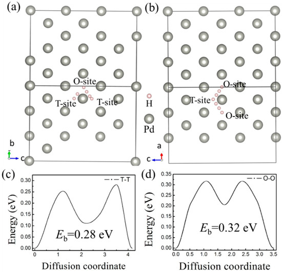 H bubbles would form inside or on the surface of a material when the irradiation dose reaches a threshold value, according to experimental studies [3,6,8]. A large-scale diffusion of H impurities inside the lattice is commonly believed to be the origin of hydrogen bubble formation. More importantly, complex defects would be formed under the irradiation environments, which is deemed to be more favorable for the formation of hydrogen bubbles [7]. Therefore, monovacancy and divacancy defects were considered in this paper to study the effect of vacancy defects on the diffusion behavior of H atoms. First, the diffusion barriers of H atoms between the interstitial sites in the ideal Pd-lattice were calculated by the CI-NEB method. H atom diffusion from the T-site to another T-site (expressed as T–T) and from an O-site to another O-site (expressed as O–O) was considered (Figure 4a,b). According to the results, we found that is an intermediate site for both T–T and O–O diffusion pathways. The intermediate site is the O-site for the T–T path, and when the diffusion path is T–T, the H atom would go through an O-site. Therefore, it can be concluded that the diffusion pathways of H impurities among the interstitial sites in fcc-pd are T–O–T and O–T–O, which is consistent with previous results from molecular dynamics (MD) [48] and DFT [49]. The diffusion barriers are 0.28 eV and 0.32 eV for the T–O–T and O–T–O path, respectively.