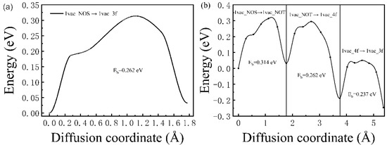 The corresponding diffusion barrier energies of (a) 1vac_NOS → 1vac_3f and (b) 1vac_NOS → 1vac_NOT → 1vac_4f → 1vac_3f.