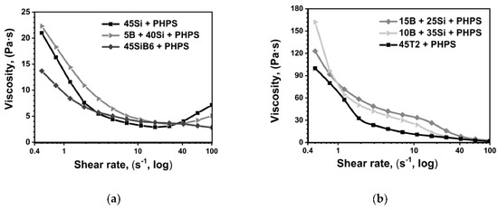 Viscosity curves of filler loaded coating slurries: (a) 45Si, 5B+40Si, 45SiB6 systems; (b) 15B+25Si, 10B+35Si, 45 T2 systems; measured at room temperature.