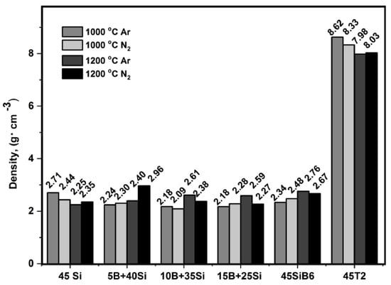 Density and porosity are important physical and microstructure properties for environmental barrier coatings. The density of porous materials can be defined as a bulk density, , which refers to the entire volume of the sample body, and this can be geometrically determined; the skeletal density, , is the volume of the specimen without the volume of the open pores; the true density, , refers to the volume of the solid material without all pores [25,27]. The skeletal density of bulk samples was measured using a helium pycnometer. The values of the skeletal density of bulk samples after pyrolysis in Ar or N2 at 1000 °C and 1200 °C are presented in Figure 2. To determine the true density, samples crushed prior to the measurement were investigated.