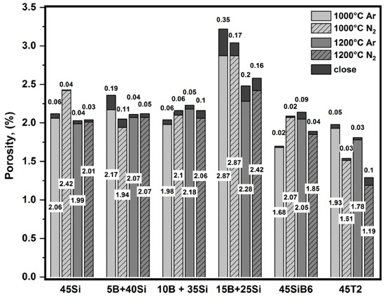 Figure 3 presents the values of the open and closed porosity of the samples after pyrolysis in Ar and N2 at 1000 °C and 1200 °C.