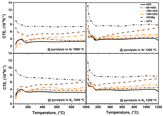 Another important point in case of coatings is the thermal expansion behavior, thus the linear coefficient of thermal expansion (CTE) of bulk samples was measured (Figure 4). Prior to the measurement of the thermal expansion up to 1200 °C in Ar, the samples were subjected to pyrolysis in Ar or N2 at 1000 °C or 1200 °C for 1 h.