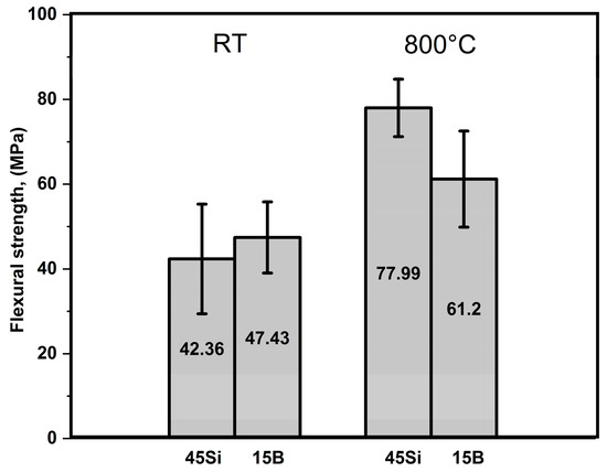 Flexural strength of 45Si and 15B + 25Si samples at room temperature (RT) and 800 °C in air.
