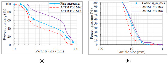 The coarse aggregates were replaced with RCA during the preparation of GRAGC. The RCA has been extracted from crushing concrete cylinders and having the CS varying from 30 MPa to 45 MPa at 6 months to 1 year of age. Different properties of recycled aggregates have been shown in Table 1 according to ASTM C33 [39]. The maximum size of the recycled aggregate was 10 mm. The Lawrancepur sand was used which is locally available and having an apparent particle density of 2586 kg/m3 with a fineness modulus of 2.25. The granular analysis of RCA and sand used in the current study is shown in Figure 1. In this study, class F fly ash (60%) and soil granulated blast furnace slag (GGBS, 40%) were used as binders in GRAGC which is locally available in the market. Various features of fly ash were reported in Table 2. In the mass ratio of 1:2.5, a combination of NaOH (14 M molarity) and Na2SiO3 was employed as an activator. For fresh testing, a slump test was performed as per ASTM C143/C143M-15 [40] and reported a slump value of 125 mm in the case of fresh GRAGC. According to ASTM C807-13 [41], a setting time of 90 min was recorded. To verify the CS of GRAGC, six 150 mm 300 mm concrete cylinders were filled during the casting of column specimens. When the columns were measured, the cylinders were also measured on the same day. The GRAGC showed an average strength of 34.5 MPa with a mean difference of 2.27 MPa.