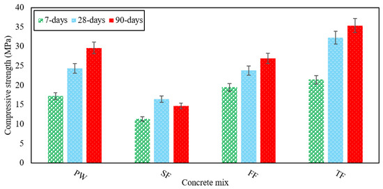 In this study, CS was observed for each of the four separate RAGC mixes at 7, 28, and 90 days of testing following ASTM C39 [46]. Figure 2 shows the CS of each varying RAGC mix. For each age group, three produced samples of all RAGC mixes were put in a compression testing machine, and then their mean results were determined. The maximum CS was shown by the TF mix, while the lowest CS was shown by the FF RAGC blend at all the various test ages. The control mix (FW) was produced to carry out a detailed analysis of the results of various other RAGC mixes made using various forms of effluent. After 7 days of testing, the CS of 19 MPa was recorded in the case of FW, and CS improved by 21% have a value of 24 MPa after 28 days of testing. The CS was 27 MPa when measured at 90 days, which was 130% of the CS calculated at 7 days. Hence, the FW mix has shown continuous improvement in its CS with the curing ages.