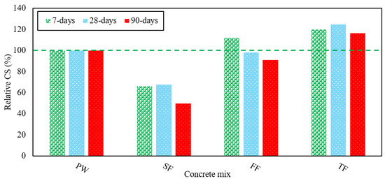 CS of various RAGC mixes relative to FW at 7, 28, and 90 days of testing.