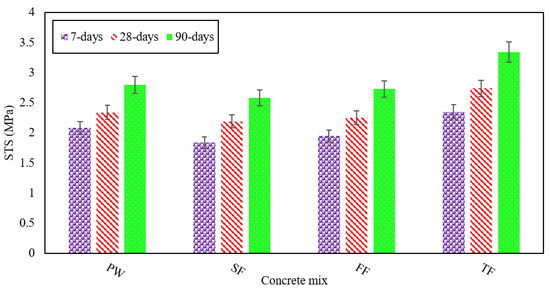 Figure 4 illustrates the STS as shown by various RAGC mixes which were produced using different effluent types. These experiments were conducted at 7, 28, and 90 days of casting according to ASTM C496 [45]. The average STS of the FW mix was 2 MPa at 7 days, 2.3 MPa at 28 days, and 2.8 MPa at 90 days, separately. This indicates that an STS of 117% of its strength at 28 days was shown by the FW mix at 90 days. The highest STS was shown by the TE mix, while the lowest was shown by the FF mix.