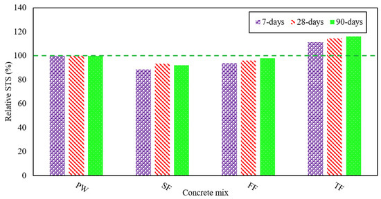 The TF mix displayed improved STS of 2.3 MPa at 7 days, 2.7 MPa at 28 days, and 3.3 MPa at 90 days, and was on average 11%, 14%, and 16% higher than those of the FW mix measured at 7, 28, and 90 days, separately. The tensile strength demonstrated by the TF mix was better, the reason is that TE has lower bicarbonates than the other forms of effluent. It seems that the rise in bicarbonates contributes to a decrease in concrete tensile strength [48]. The fly ash augmented the STS of RAGC mixes due to development in the particle size distribution in the concrete matrix by filling the voids between cement and sand particles. It changes the binder mix to CSH-gel giving a strong bond between the particles of RAGC.