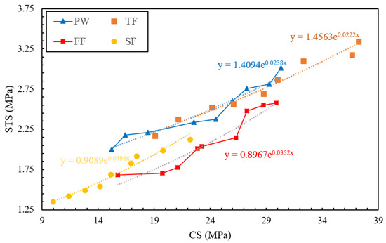 Figure 6 reports the experimental relationship between the CS and STS of various RAGC mixes. New mathematical models reporting the relationships between CS and STS of RAGC mixes made with different types of effluents were also presented in Figure 6. The predictions of various previously proposed models (reported in Table 5) describing the relationships between the CS and STS of plain concrete mixes at the testing ages of 28-days were compared with the experimental results of various RAGC mixes. The comparative study between the experimental results and the predictions of various models for predicting the STS of RAGC mixes was reported in Figure 7.