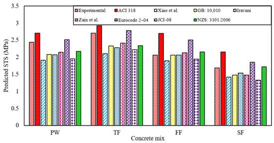 The model given by ACI 318 [52] portrayed the % age discrepancies of 11.25%, 7.94%, 30.85%, and 27.91% for FW, TF, FF, and SF mixes, respectively. These deviations were the highest as compared with the predictions of the other models. The highest discrepancy for ACI 318 [52] may be ascribed to the reason this model was recommended for the normal strength concrete made with freshwater having NCA but, in the present research, RCA was employed for the fabrication of RAGC mixes. The Xiao et al. [53] model portrayed the % age discrepancies of 21.65%, 22.25%, 7.96%, and 15.89% for FW, TF, FF, and SF mixes, respectively. The model proposed by GB: 10,010 [54] represented the % age discrepancies of 14.65%, 14%, 0.19%, and 12.47% for FW, TF, FF, and SF mixes, respectively. The Iravani [55] model portrayed the % age discrepancies of 15%, 15.65%, 0.15%, and 8.76% for FW, TF, FF, and SF mixes, respectively. The Zain et al. [56] model depicted the % age discrepancies of 11.89%, 10.95%, 3.4%, and 12.5% for FW, TF, FF, and SF mixes, respectively. Similarly, the model suggested by Eurocode 2-04 [57] showed the % age discrepancies of 3.3%, 2.77%, 21.33%, and 10% for FW, TF, FF, and SF mixes, respectively. The model suggested by JCI-08 [58] displayed the % age discrepancies of 19.64%, 17.82%, 5.75%, and 21.27% for FW, TF, FF, and SF mixes, respectively. And lastly, the anticipated model by NZS: 3101:2006 [59] demonstrated the % age discrepancies of 11%, 13.66%, 4.68%, and 2.33% for FW, TF, FF, and SF mixes, respectively. Therefore, the present study, after the proposed models in the present study that presented the highest accuracies, suggests using Eurocode 2-04 [57] for predicting the STS of FW mix and TF mix, JCI-08 [58] for predicting the STS of FF mix, and NZS: 3101:2006 [59] for predicting the STS of SF mix.
