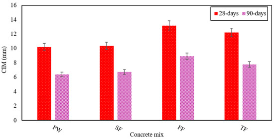 The control mix had shown a CIM of 10.2 mm at 28 days and 6.4 mm at 90 days. The TF mix demonstrated CIM that was 16% and 17% superior to that of FW after 28 and 90 days, separately. This proves that the TF blend is more vulnerable to the oxidation of steel bars and rust. The CIM shown by the FF mix was 13.2 mm for 28 days and 9 mm for 90 days, separately. Due to rich in chloride and sulfate, the FE induces corrosion and faster penetration of chloride ions into concrete [61]. The chloride ion penetration is also risen due to the very low pH of the FE mix [51]. Thus, the chloride ion penetration shown by SE was the least among all the types of effluent examined, which indicates that it is less corrosion-resistant, whereas the FE showed the highest values for penetration of chloride ion and is, therefore, more prone to corrosion. The fly ash results in a decrease in the CIM due to the development of CSH-gel and the filling of voids between the cement and sand particles giving a denser matrix that prevents the CIM from the RAGC mix.
