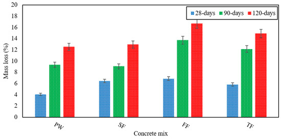 It is very susceptible to acid attack because of the alkaline nature of concrete. As these acid attacks occur in the drainage system, they cause effluent to deteriorate. That is why the tolerance to acid attacks becomes an essential parameter of durability that must be observed. H2SO4 is the most violent and damaging acid among all the other acids and having a low pH. It easily reacts with CH forming CaSO4 leads to rapid degradation of concrete. This study examined the mass loss of specimens taken as concrete degradation at 28, 90, and 120 days. Later, they were submerged in a 4% H2SO4 solution. In Figure 9, the mass loss experienced by each of the RAGC mixes is presented. For the FF mix, the highest degradation was observed.