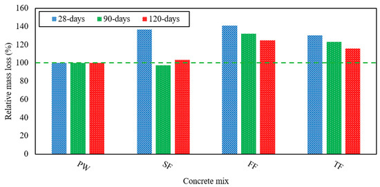 The TF mix shows faster deterioration associated with the design control mix. At 28 days, the TF revealed mass losses of 5.8%, 12% at 90 days, and 15% at 120 days, which were on average 30%, 23%, and 16% better than to the control mix. The FF mix recorded mass losses of 6.8% at 28 days, 13.7% at 90 days, and 16.7% at 120 days, which were on average 40%, 32%, and 24% superior to the control mix. Concrete deterioration is also mainly influenced due to the pH value of acid and the mixing of effluent. The significant mass loss could be due to the sulfate-rich in FE. The FF mix exhibited the highest deterioration in the initial days, but the deterioration was very close to that of FW at 90 and 120 days. Due to the H2SO4 attack, the SF mix showed higher mass losses that were 6.4% at 28 days, 9% at 90 days, and 13% at 120 days separately. Thus, we can conclude that with the use of all the various forms of effluent that were studied, the degradation of concrete becomes more severe. The relative mass losses of different concrete mixes due to acid attack at several testing ages are shown in Figure 10. The adding of fly ash in the GPC fills the micro-cracks and results in a decrease in the acid absorption of RAGC mixes because of filler and the development of CSH-gel after the pozzolanic reaction of CH and fly ash particles. Consequently, the penetration of H2SO4 in RAGC will be less giving less loss of mass at various testing ages.