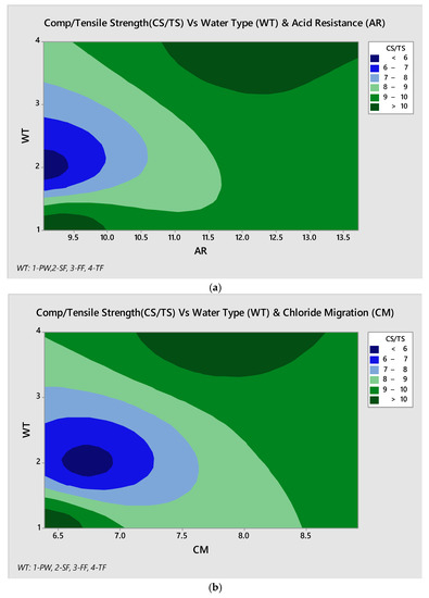 It is necessary to study the relationship pattern of strength parameters with reference to water type utilized and performance analysis of developed concrete under different environmental conditions like acid resistance and chloride migration. These parameters are linked with natural soil and environmental conditions. So, the compressive to tensile strength ratio has been studied with reference to water type utilization and Acid resistance. From Figure 11, it can be observed that at 90 days of strength conditions, textile wastewater produces higher strength and better resistance to maintain its strength level. Similarly, under chloride migration condition there is a greater trend of chloride migration concerning water type and especially textile water produces higher strength level under varying circumstances. However, sugar mill wastewater has performed in lower-order by performing towards lower strength development against both acid resistance and chloride migration conditions.