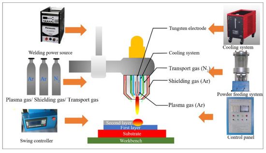 In-situ TiN-Ti composite coatings were fabricated by using a plasma transferred arc welding machine (Shanghai Benxi Ltd. Company, Shanghai, China). The schematic diagram of plasma transferred arc welding is shown in Figure 2. Nitrogen gas (99.99% purity) was used as the transport gas, and argon gas (99.99% purity) was used as the plasma gas and the shielding gas. The welding parameters were optimized in order to obtain the composite coatings with good appearance and with no defects, such as surface cracks and pores. The optimized parameters were described below: welding current 64A, welding speed 1.2 mm/s, powder feeding rate 8.8 g/min, plasma gas flow 4.5 L/min, transport gas flow 5.0 L/min, and shielding gas flow 6.0 L/min. The specimens after plasma transferred arc welding were cooled slowly in the air.