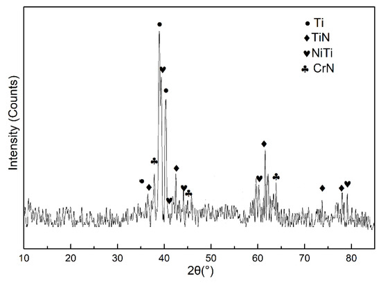 The XRD pattern of in-situ TiN-Ti composite coatings is given in Figure 3. It is observed that the main phases in the composite coatings are TiN, Ti, CrN, and NiTi. There was no TiN, CrN, and NiTi in the raw materials, and hence these phases were formed during the plasma transferred arc welding process. Compared with the standard diffraction peaks of Ti, there is an obvious deviation of angle to the left, which means that some solute atoms with a larger atomic radius are dissolved in the Ti matrix. This may be attributed to the lattice distortion resulting from the dissolving of Nb atoms in Ti matrix according to the fact that no compounds containing Nb are found in the XRD results.