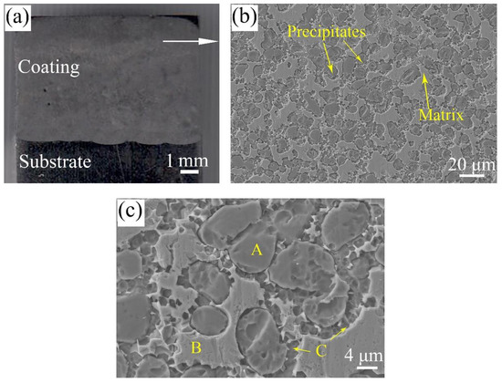 Morphologies on the cross section of the composite coatings: (a) macro-morphology; (b) the typical microstructure; and (c) high magnification.