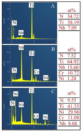 Figure 6 is the EDS results of the marked locations in Figure 4. The EDS results demonstrate that the precipitates are composed of 58.19 at.% Ti-7.09 at.% Nb-34.72 at.% N. According to the XRD results and the proportion of each element, it can be inferred that the precipitates (A) are TiN particles. It is worth mentioning that TiN particles were not added into the raw materials beforehand. In other words, TiN particles were in-situ formed by dint of the reaction between Ti powders and N2 under the effect of the plasma arc. During plasma transferred arc welding, Ti powders in a molten state were transported into the molten pool by nitrogen gas. Thus, Ti powders were fully exposed to nitrogen gas, and the in-situ reaction tended to easily happen. Moreover, in-situ TiN particles with a size in the range of 5–18μm evenly distribute in the matrix. The grey matrix (B) is identified as Ti matrix due to the high atomic mass percentages of Ti (64.92 at.%). Obviously, the content of Nb in Ti matrix is comparatively high. This is because a small number of Nb powders are consumed and enter into in-situ TiN particles, and other Nb atoms dissolve in the Ti matrix. Certainly, this is also in accordance with the XRD results. As depicted, the sunken particles (C) are composed of 41.33 at.% Ti-29.96 at.% Ni-9.55 at.%. N-11.08 at.% Cr-8.08 at.% Nb. It can be inferred that the sunken particles are CrN and NiTi [25]. However, it is hard to distinguish them in SEM. Hence, TEM was utilized for the further study on the microstructure of the composite coatings.