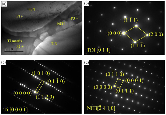 The TEM image and the selected area electron diffraction (SAED) patterns of the composite coating are shown in Figure 7. The EDS results of the marked locations are given in Table 1. According to the EDS results and the SAED patterns in Figure 7b,c, in-situ TiN particles with face-centered cubic structure are identified, and the matrix is regarded as a Ti matrix with a hexagonal close-packed structure. As demonstrated in Figure 7a, several blocky particles with uniform size (about 1 μm), which have a similar appearance to the sunken particles in Figure 4c, are observed in the interface. The SAED pattern along the zone axis of [-2 1 1 0] demonstrates that the blocky particles are NiTi particles. NiTi particles are evenly embedded in the interface, and the pinning effect of NiTi particles can be conducive to the enhancing of the performance of the composite coatings.